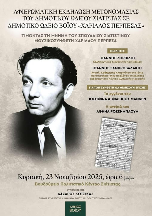 Σε μια ιδιαίτερα συγκινητική και ταυτόχρονα ιστορική βραδιά για τον Δήμο Βοΐου, πραγματοποιήθηκε την Κυριακή 23 Νοεμβρίου 2025, στο Βουδούρειο Πολιτιστικό Κέντρο Σιάτιστας, η αφιερωματική εκδήλωση μετονομασίας του Δημοτικού Ωδείου Σιάτιστας σε Δημοτικό Ωδείο Βοΐου «Χαρίλαος Περπέσας», προς τιμήν του σπουδαίου Σιατιστινού μουσικοσυνθέτη.