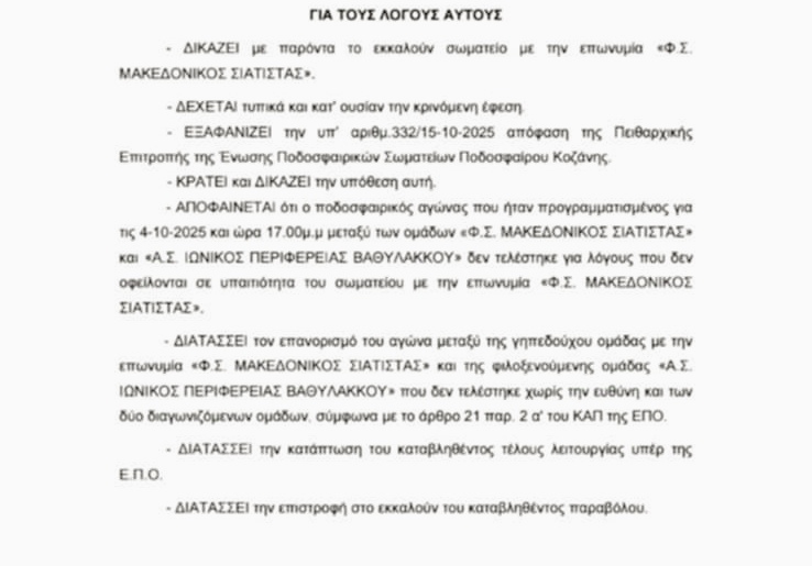 Πρόκειται για μια καθαρή δικαίωση του Μακεδονικού Σιάτιστας, που αποδεικνύει ότι ο σύλλογος δεν έφερε καμία ευθύνη για τη μη διεξαγωγή του αγώνα και ανοίγει τον δρόμο για να παιχτεί το παιχνίδι μέσα στα γήπεδα, όπως πρέπει.