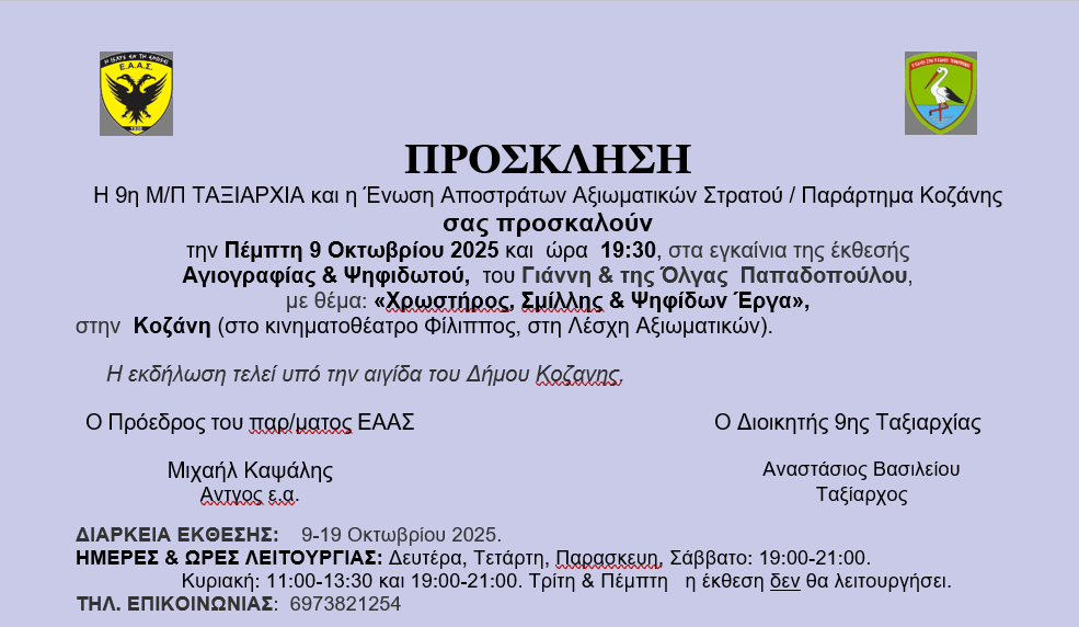 Η εκδήλωση θα πραγματοποιηθεί την Δευτέρα 13 Οκτωβρίου 2025 και ώρα 6 το απόγευμα, στον Συνεδριακό Χώρο του Τραμπάντζειου Γυμνασίου στην Σιάτιστα. Βασικός ομιλητής θα είναι ο κ. Ιωάννης Ζούκας, Στρατηγός εν αποστρατεία και Επίτιμος Διοικητής του Γ’ Σώματος Στρατού.