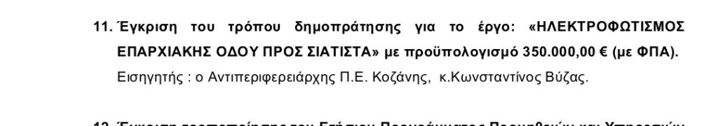 Μεταξύ αυτών ξεχωρίζει η έγκριση του τρόπου δημοπράτησης για το έργο «Ηλεκτροφωτισμός επαρχιακής οδού προς Σιάτιστα», προϋπολογισμού 350.000 ευρώ (με ΦΠΑ).