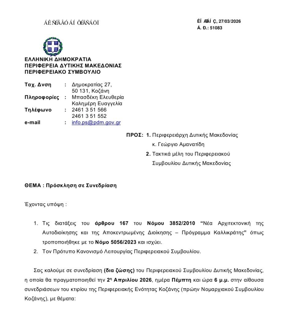 Συνεδριάζει το Περιφερειακό Συμβούλιο Δυτικής Μακεδονίας την Πέμπτη 2 Απριλίου 2026, με σειρά σημαντικών θεμάτων στην ημερήσια διάταξη.